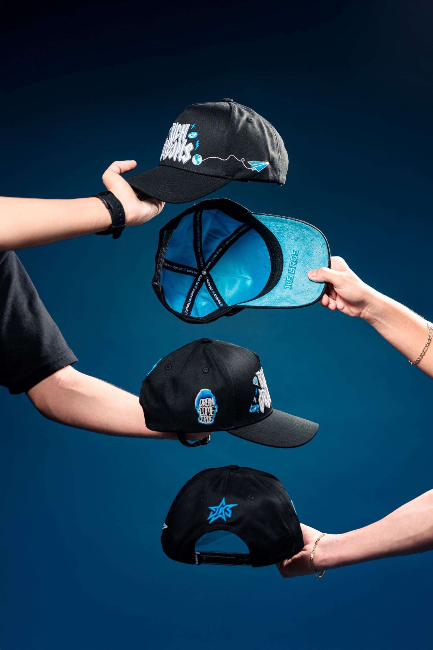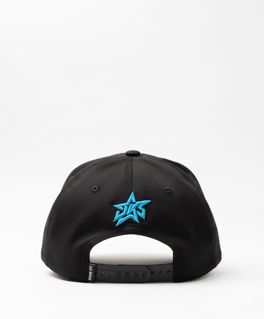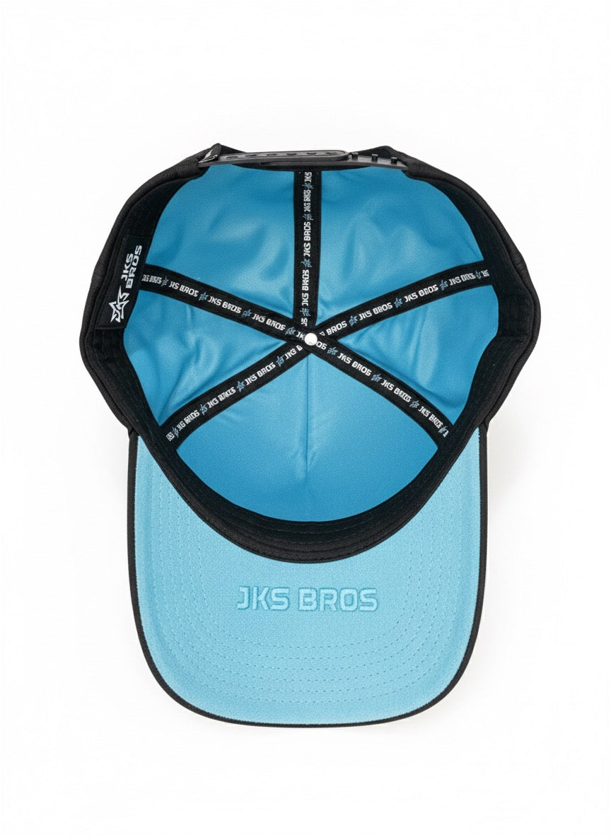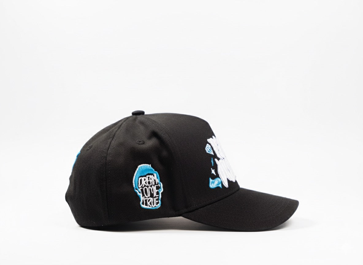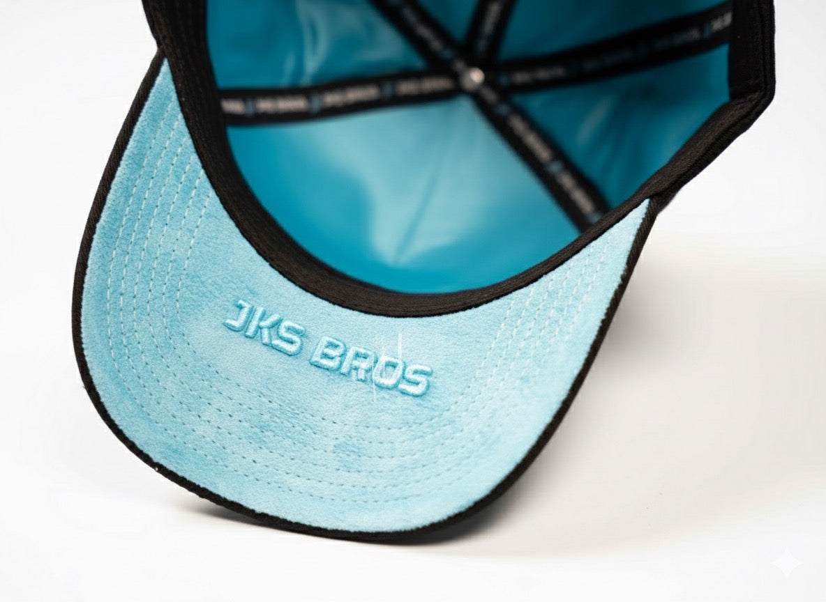 Base negra, bordado 3D frontal, visera de gamuza azul y detalles exclusivos en cada costura.